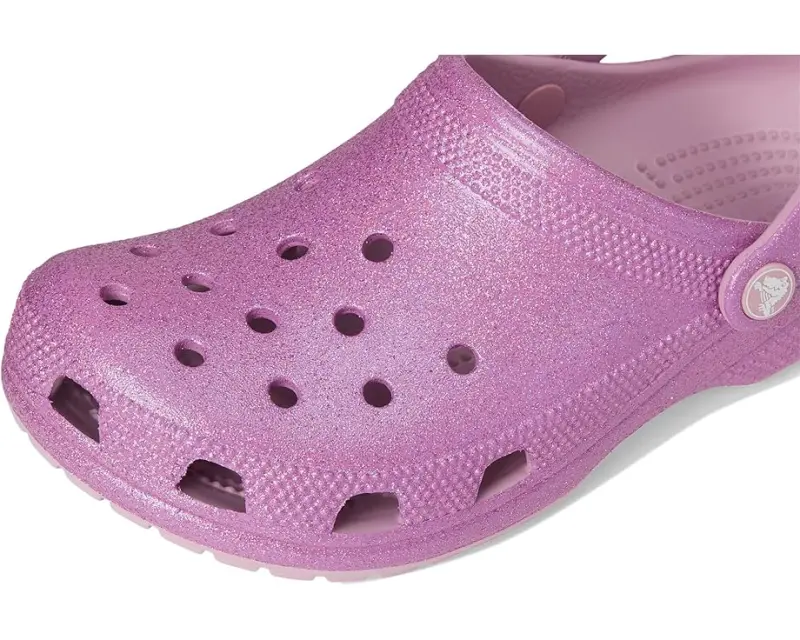 • Let the fun begin in the Crocs® Classic Clog – Glitter. Croslite™ uppers are available in a variety of colors in patterns in a slip-on design with an adjustable heel strap and ventilation ports for breathability.